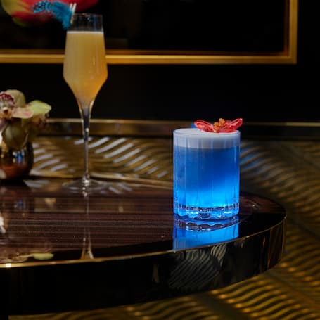Bar central seating area in Collins Blue cocktail with garnish on a table with another cocktail in the background