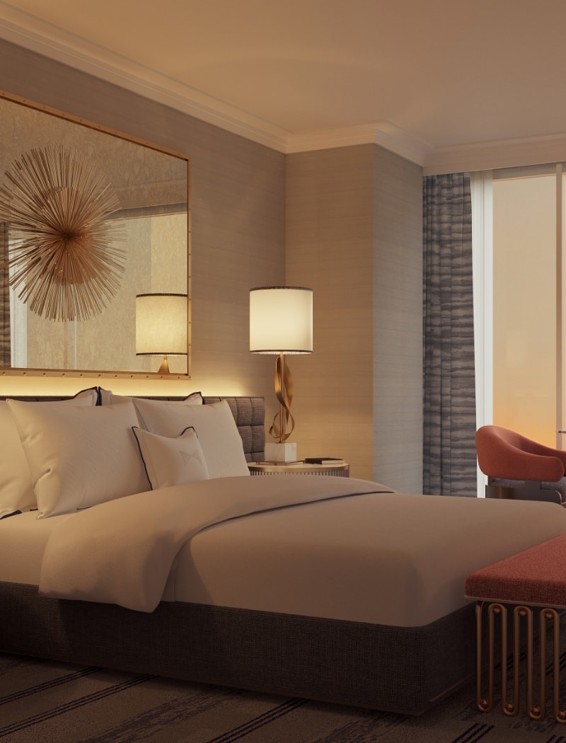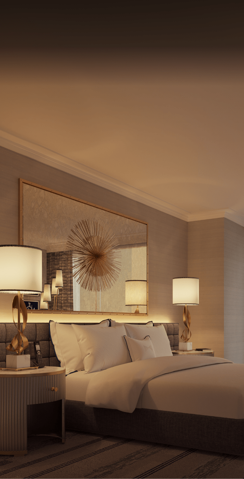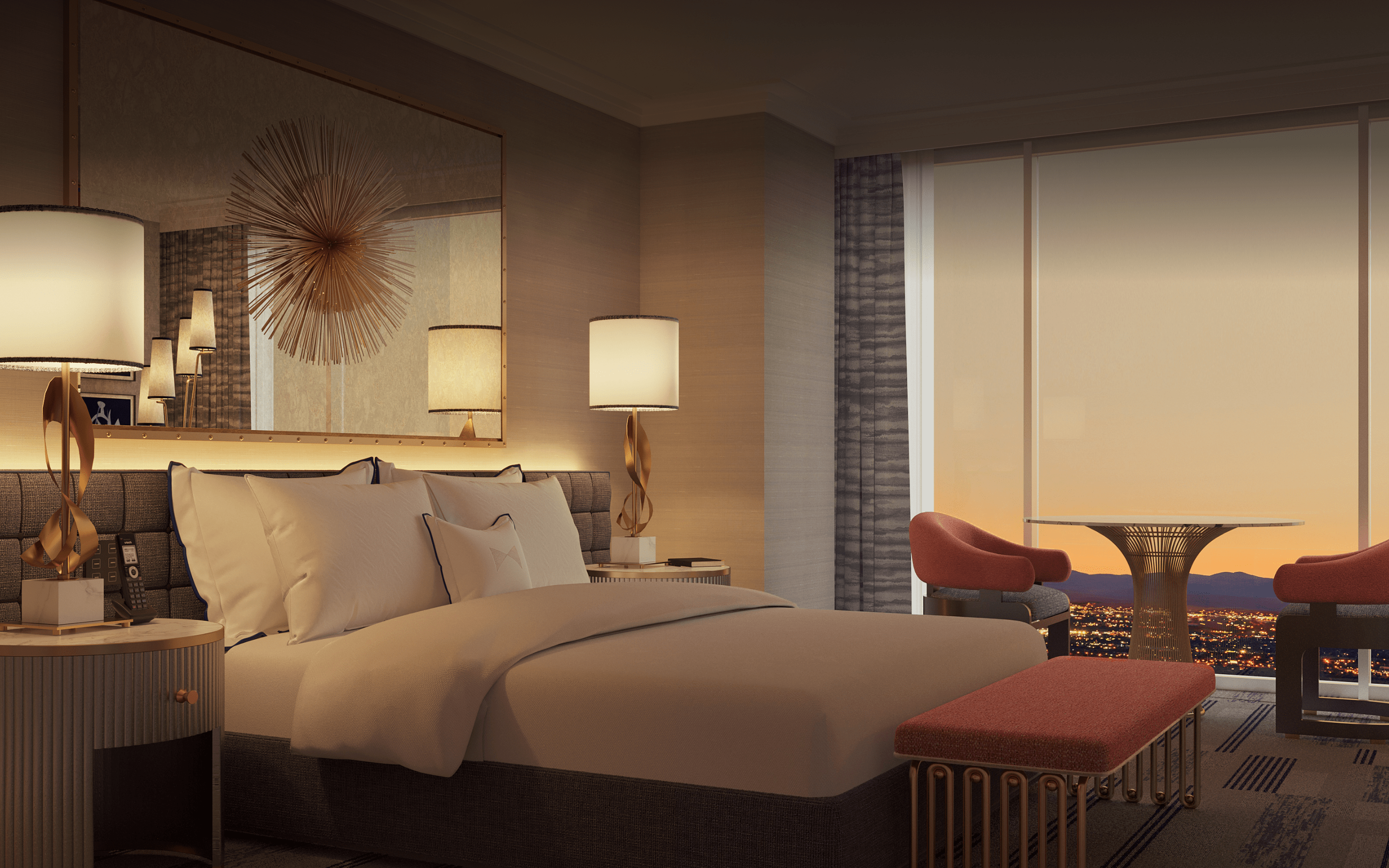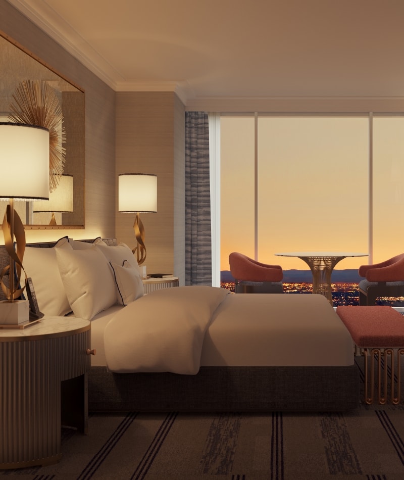 Luxury never goes out of style, just like our Bleau guest rooms. Comfortably chic and beautifully appointed, these rooms offer the ultimate getaway. Warm pops of color blend with subtle blues, echoing the resort’s vibe, while gold accents, soft lighting, and plush textures captivate the eye. Floor-to-ceiling windows reveal stunning views of the Las Vegas Strip or surrounding mountains.