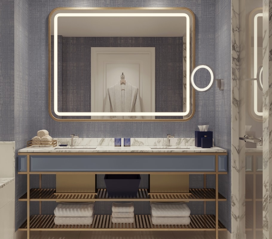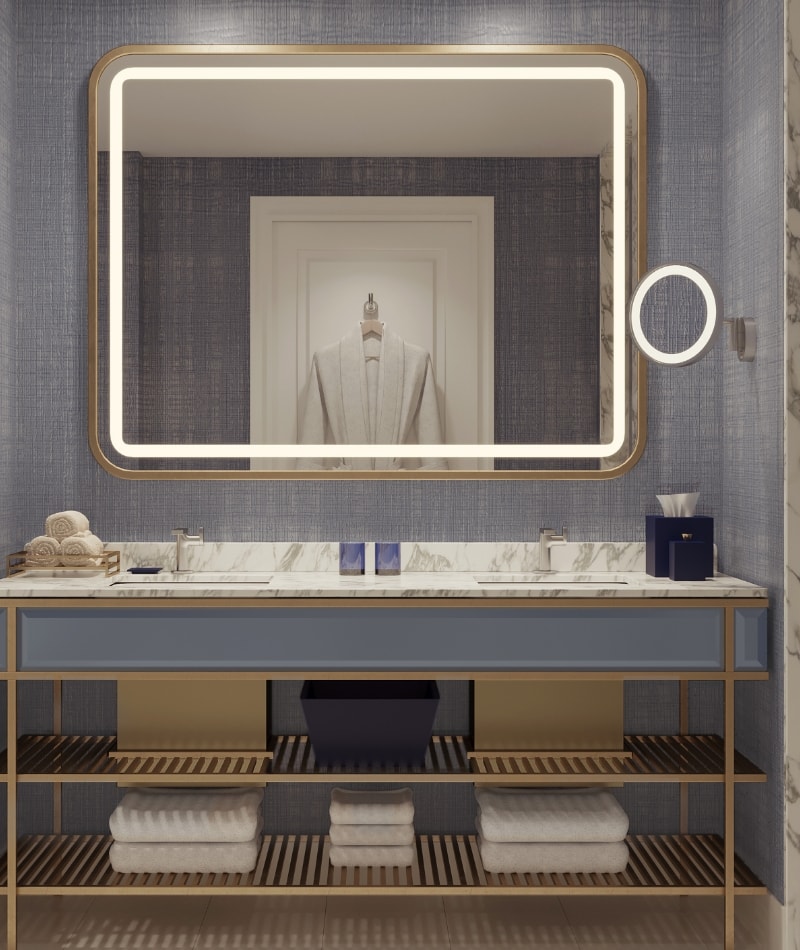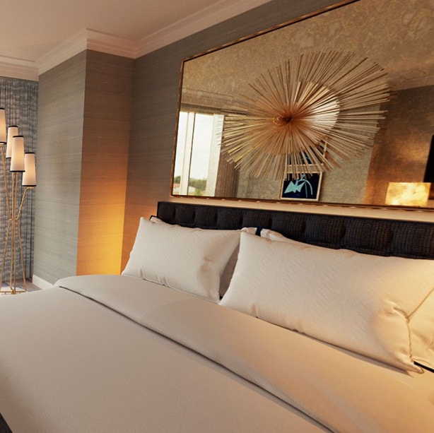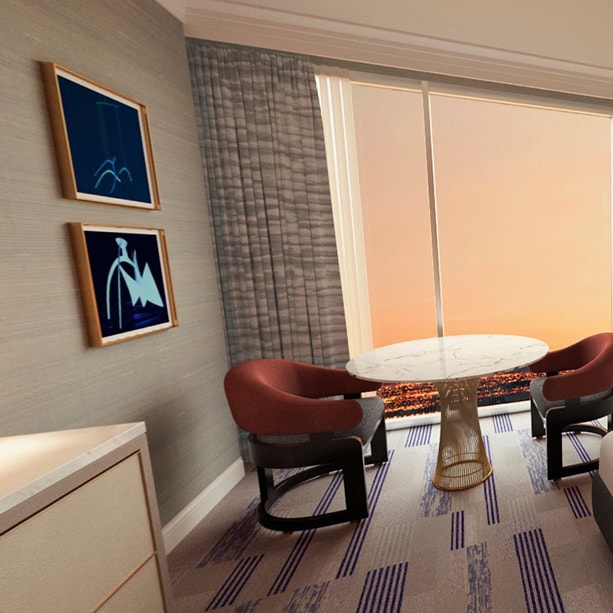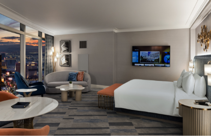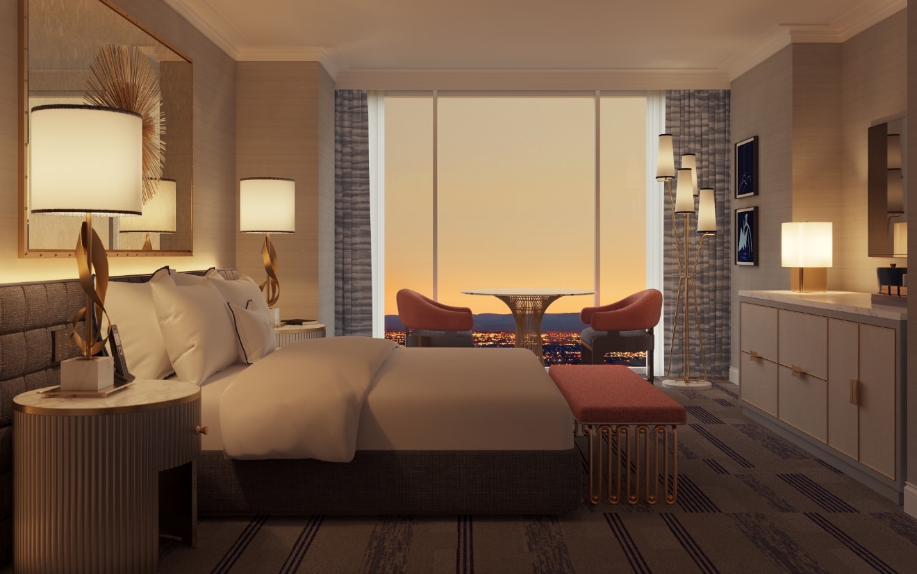 Luxury never goes out of style, just like our Bleau guest rooms. Comfortably chic and beautifully appointed, these rooms offer the ultimate getaway. Warm pops of color blend with subtle blues, echoing the resort’s vibe, while gold accents, soft lighting, and plush textures captivate the eye. Floor-to-ceiling windows reveal stunning views of the Las Vegas Strip or surrounding mountains.
