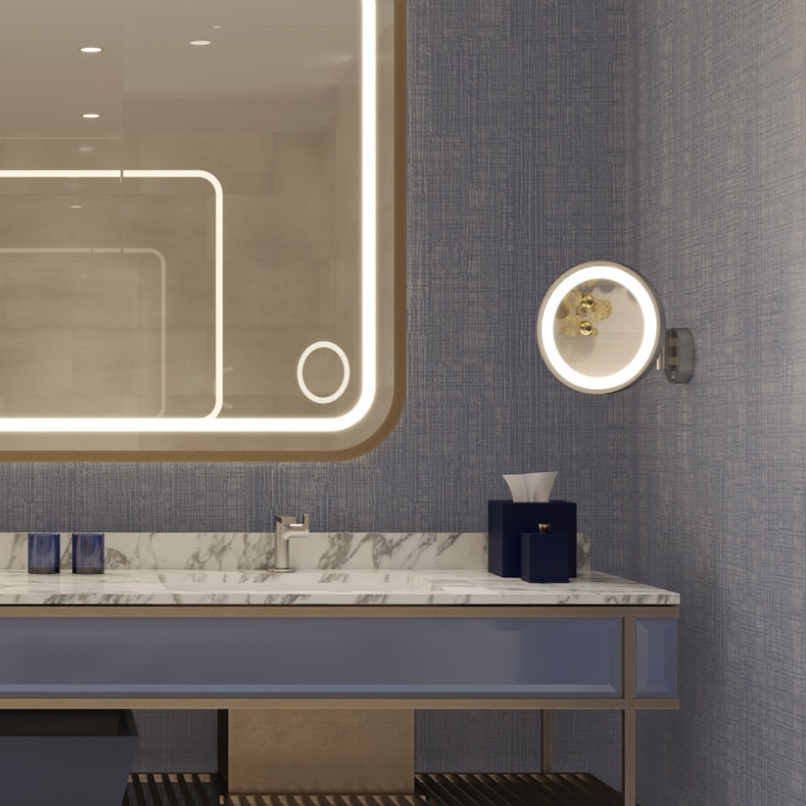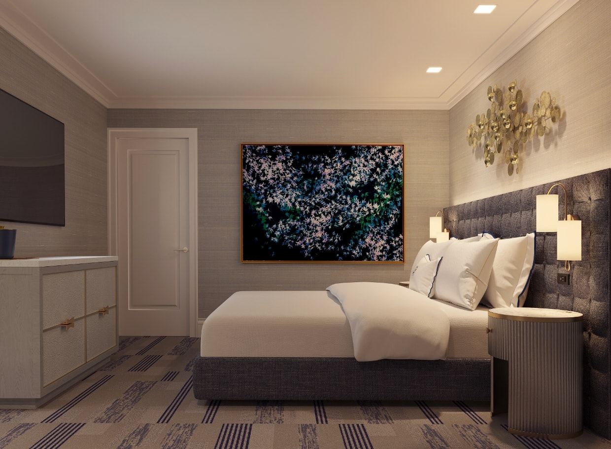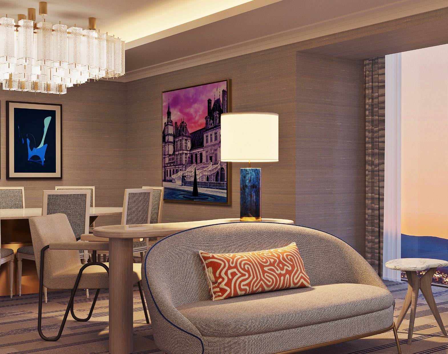 Enter through dramatic double doors into the Executive Suite, a spacious enclave above the Strip. This elite suite features a generous king bedroom with an en-suite bathroom, walk-in shower, and soaking tub.