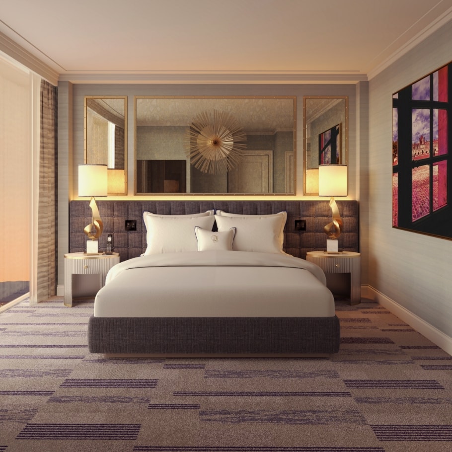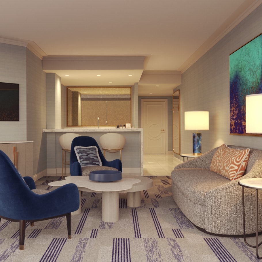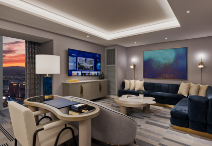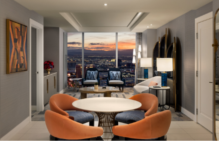 Perched above the Las Vegas Strip, the Noble Suite offers upscale comfort and style. Enjoy a private king bedroom with an en-suite bathroom featuring either a soaking tub or oversized walk-in shower*, a spacious living area with a chic bar privé, and a second full bath. Sweeping city views make this suite an entertainer’s dream.