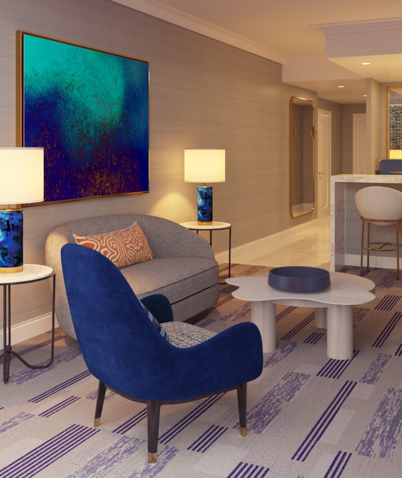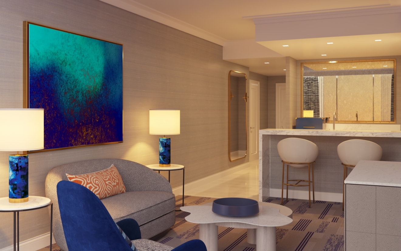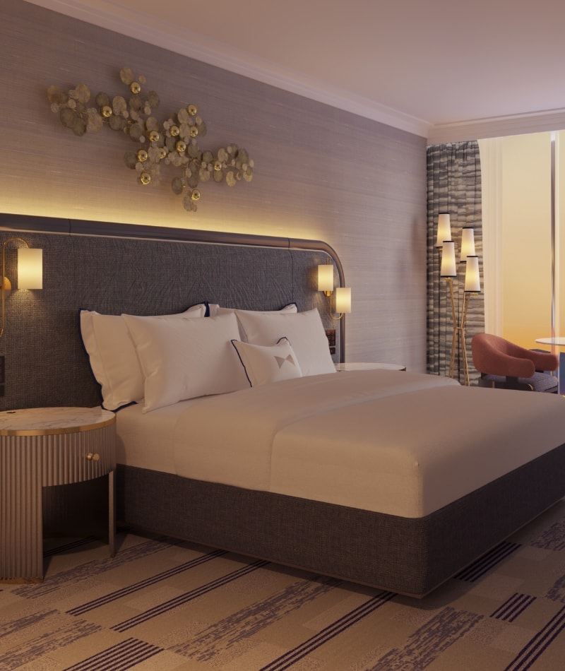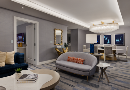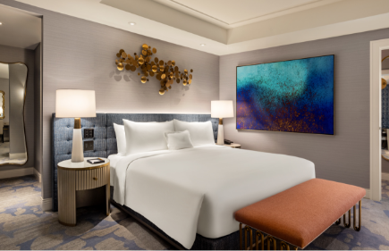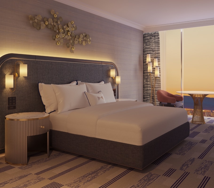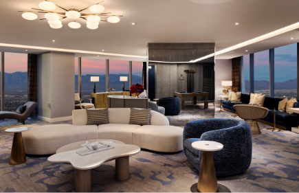 Regal in every sense, the Royal Suite exudes extravagance. Relax in a private king bedroom with a soaking tub, walk-in shower, and full vanity. The spacious living area offers plush seating, sweeping views of the Las Vegas Strip, a chic bar privé, and a second full bath.