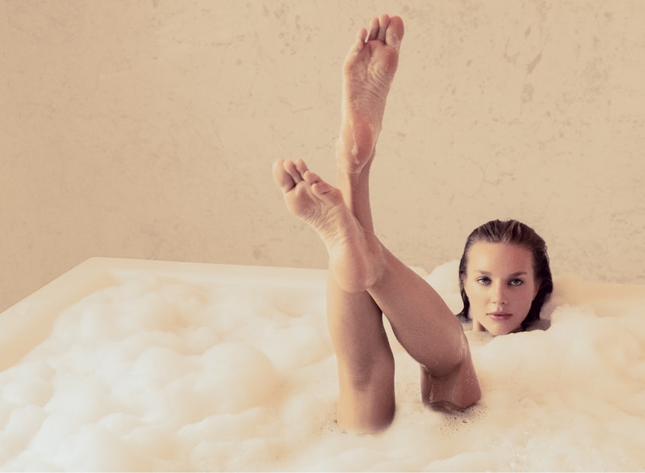 Person with hair wrapped in a towel, sitting in a bathtub overlooking the Vegas city scape